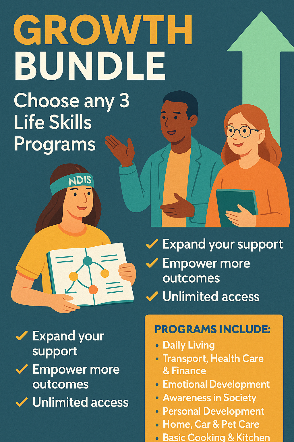 The Growth Bundle is ideal for NDIS providers looking to deliver a broader range of impactful, ready-to-use life skills programs. With this flexible mid-tier option, you can choose any three full programs from our collection to support participants across personal, social, emotional, and daily living goals.