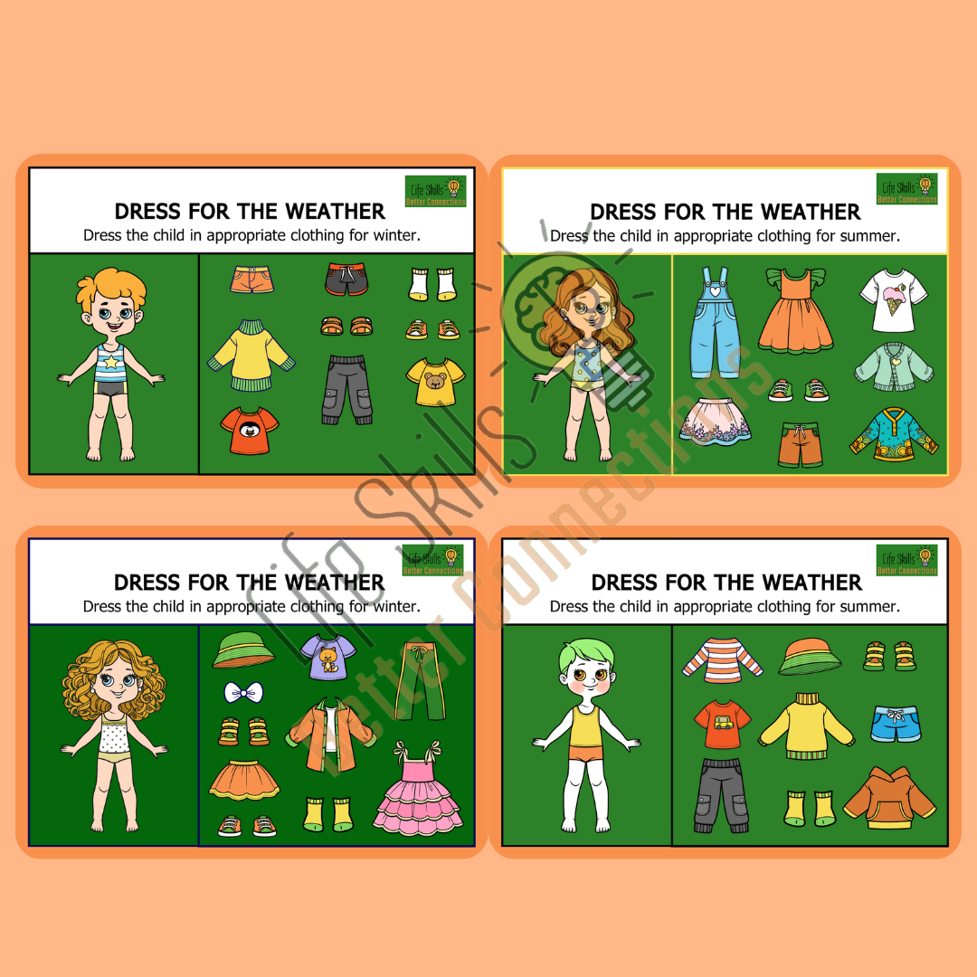 A visual dress for the weather decision-making guide that helps children choose appropriate clothing for different weather conditions.