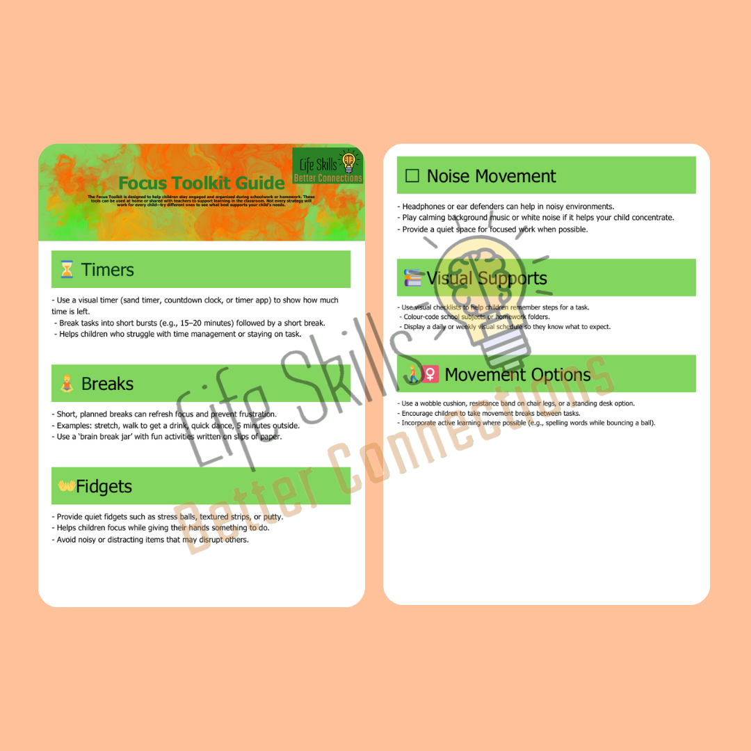 A focus toolkit guide featuring practical strategies and tools to support attention and concentration.