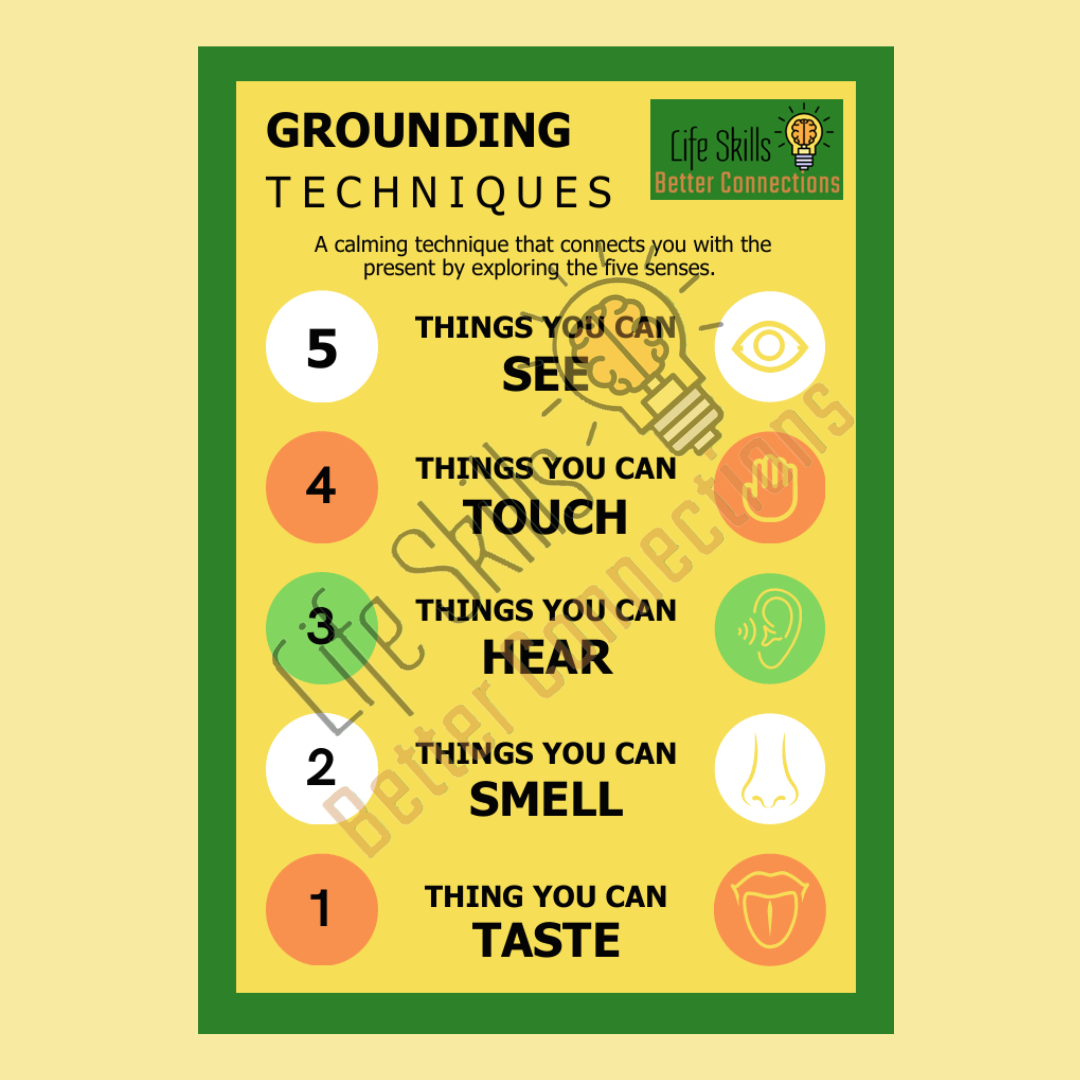 A printable grounding techniques reference sheet that teaches simple grounding strategies to manage anxiety or sensory overload.