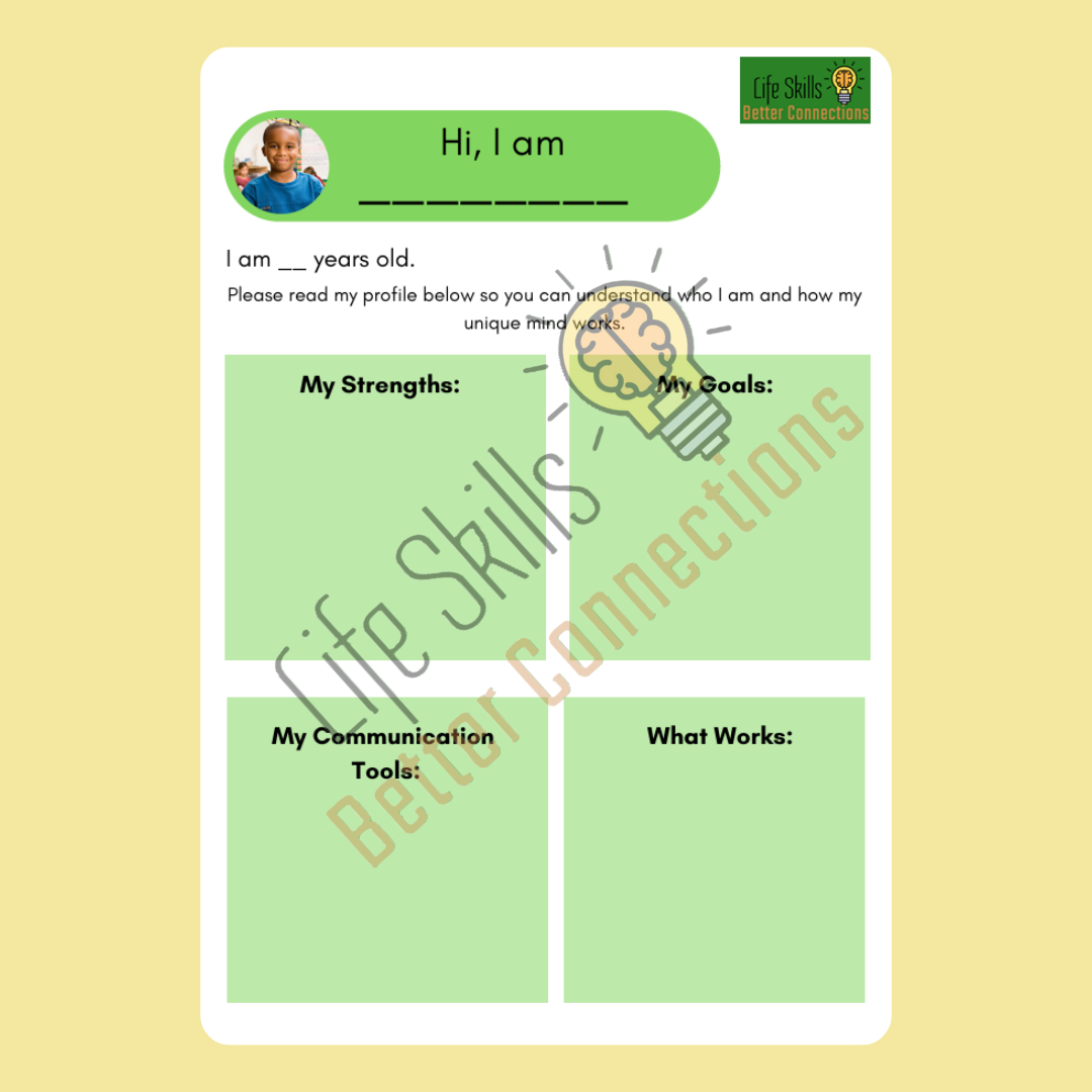 Includes space for their goals, strengths, communication tools and what helps them feel safe and happy — perfect for teachers, carers, and new environments.