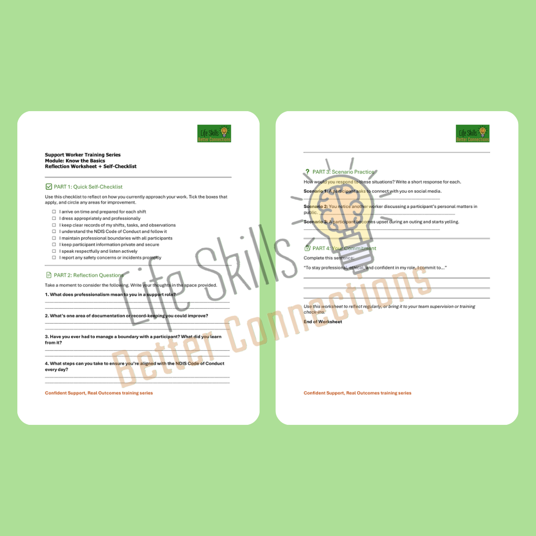 A printable Reflection Worksheet & Self-Checklist that guides support workers through reflection on their daily practice.