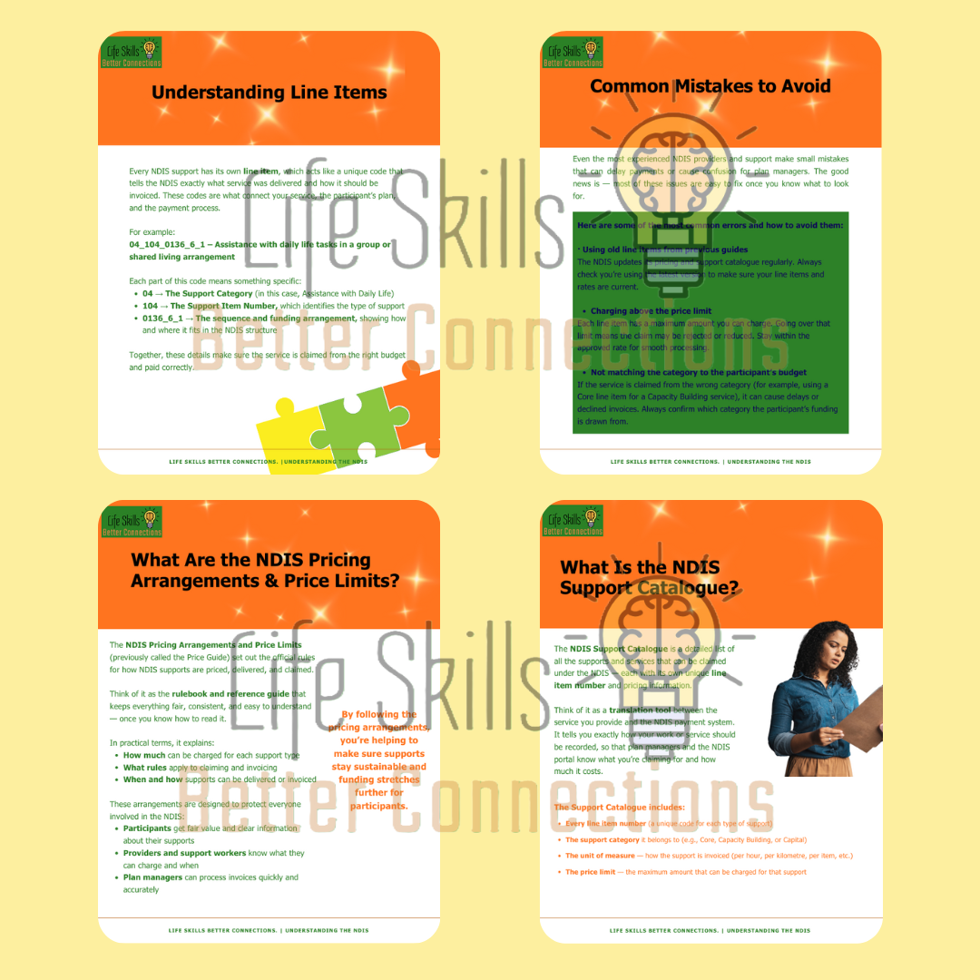 A practical 16 page guide that simplifies NDIS pricing, line items, and categories into clear language anyone can understand.